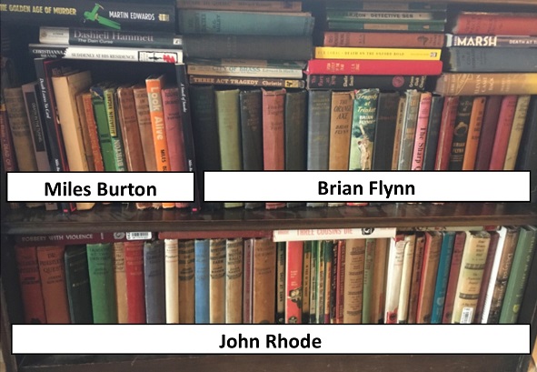 It’s been a year of 164 posts in total, consisting of 124 book reviews (including one audiobook), 6 TV and film reviews, 12 were Puzzlies and the other 21? A guest post, a book extract, a couple of challenges that I’ve either failed to complete or failed to start (sorry, Martin), an updated Carr top ten, some quizzes and puzzles and a couple of semi-serious posts on how to go about how to find books by John Rhode/Miles Burton. And of course, my own investigation into the Curious Case Of The Purloined Blog Posts and its successful resolution. Of the book reviews, they consist of 72 different authors, 3 reference works, 5 collections of short stories (admittedly, one only contained two stories), 64 Golden Age titles, 3 translated titles (well, 3.5 if you count The Realm Of The Impossible) and 11 historical mysteries. Most read authors were Simon Brett and E R Punshon on 3 books each, Paul Doherty and Michael Jecks on 4 books and then… Well, it’s either Miles Burton (5), John Rhode (11) and Brian Flynn (13) or Brian Flynn (13) and John Street with 16. Depends on how you count it. As you may have noticed, Flynn and Street have dominated my reading this year. I know some people get irked when I review books that you don’t have a cat-in-hell’s chance of finding a copy of, but… well, tough, basically. I’ve got a lot to get through – this is the current state of my shelves.