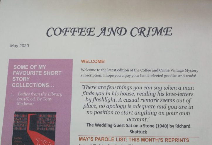 Well, there I was, grumbling at missing out on a couple of John Rhode titles on eBay, due to the fact that there is only so much money that I’m willing to spend on things made out of paper, and I thought to myself, “Puzzle Doctor, what else could you be spending your hard-earned cash on?” And the thought came to me, why not finally get off your backside and support my friend and fellow blogger Kate’s business, the Coffee and Crime Vintage Mystery Gift Box?