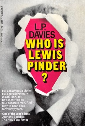 L P Davies as an author wrote about identity, states of mind and loss of control and this second novel deals with an emaciated, amnesiac man found wearing a brand new suit. Some of his books were science fiction but this is a straight mystery.
